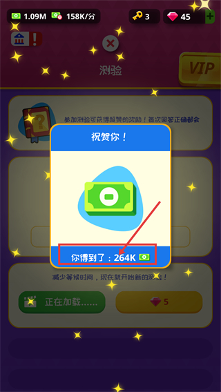4、测验完成后将获得【264K】资源奖励,界面显示“祝贺你”,本轮结束后可开启新的测验挑战。
