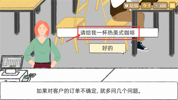 1、接到顾客需求【请给我一杯热美式咖啡】,关注界面【12:50】-时间,若对订单不确定需主动询问以明确需求。