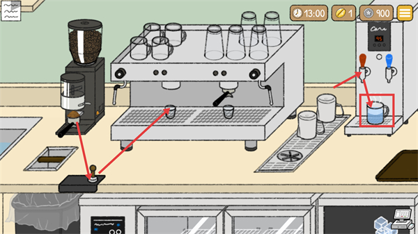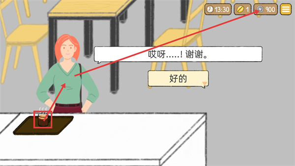 4、把制作好的热美式咖啡递送给顾客,获取反馈,界面同步更新【13:30】-时间及【900】-星星数值。
