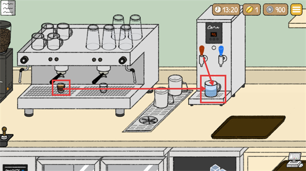 3、将萃取好的【浓咖啡】倒入盛有热水的杯子,完成调配,此时界面时间更新为【13:20】。
