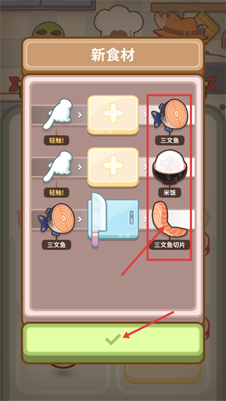 1、在【新食材】界面,轻触获取【三文鱼】-【米饭】,用【刀具】将【三文鱼】处理为【三文鱼切片】,完成后点击下方对勾确认。