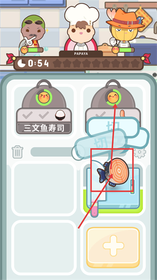 2、进入制作界面,看到【三文鱼寿司】制作框,将【三文鱼】放入对应处理区域,界面显示倒计时【0:54】,推进制作流程。