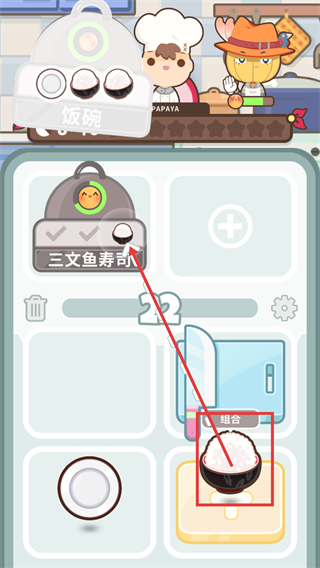 3、找到【米饭】食材,执行【组合】操作,将其添加到【三文鱼寿司】的制作框中,完成该菜品的食材组合步骤。