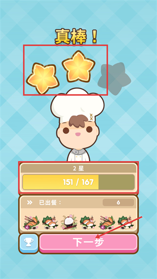 4、完成出餐后获得【2星】评价,进度显示【151/167】,已出餐【6】份,点击【下一步】进入后续流程。