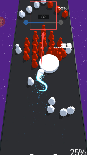 4、持续躲避:在“50% 32 250”界面左右滑动避开异色障碍,完成进度。