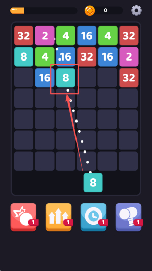 2、寻找合并机会:在方格内移动数字方块,主动寻找相同数字的相邻方块,通过触碰完成合并,生成更高阶数字方块。