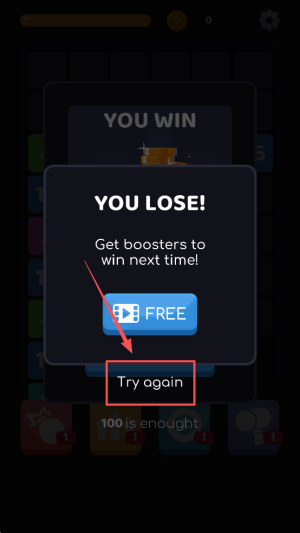 4、结束结算:出现YOU WIN或YOU LOSE!点击Tryagain重新挑战。