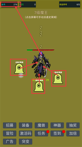 1、挑战【7级魔王】时,可依靠已积累的多只【1级史莱姆】进行攻击获取资源,同时关注顶部【金币】资源。