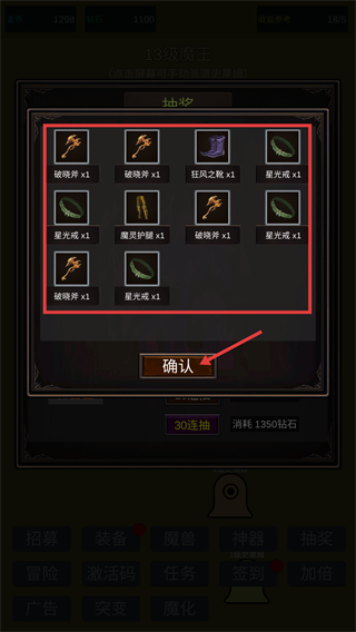 4、抽奖获得【破晓斧】【狂风之靴】等装备后,点击【确认】按钮领取奖励,这些装备可用于提升史莱姆的战斗属性。