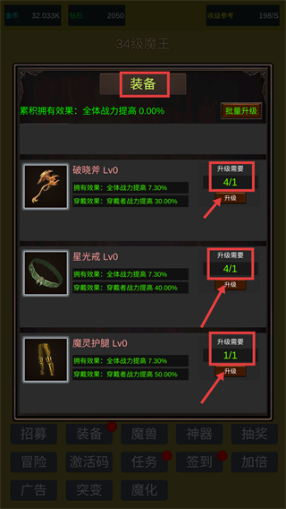 4、装备强化后可挑战【36级魔王】,此时金币与收益参考(681/S)会进一步提升,有效加快资源获取与更高等级魔王的挑战进度。