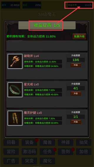 3、装备升级后,会触发“收益提高1/S”的效果,顶部【收益参考】从198/S提升至211/S,同时全体战力加成也会同步增长。