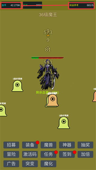 1、挑战【33级魔王】时,搭配1/2/3级史莱姆协同攻击,同时关注顶部【金币】【钻石】资源。
