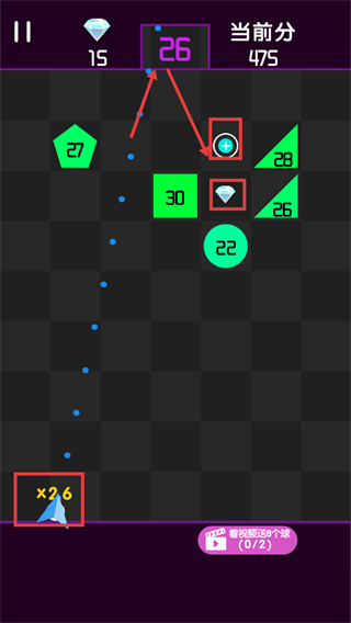 2、通过【x26】道具放大弹射收益,优先命中【+】按钮与【钻石】,同时攻击【27】【30】【28】方块,维持【当前分-475】的分数进度。