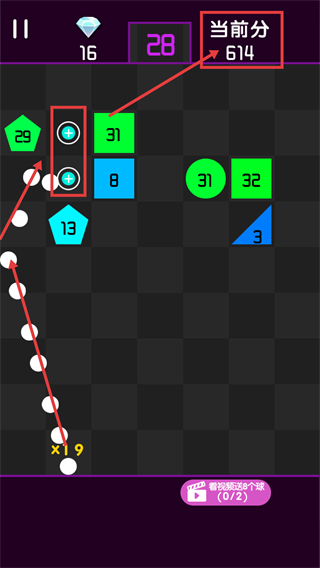 3、借助【x19】道具触发多弹珠效果,瞄准多个【+】按钮叠加增益,集中攻击【31】【32】方块,快速提升【当前分-614】。