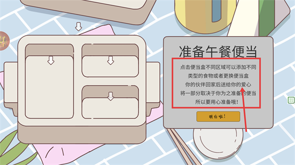 1、准备午餐便当可点击便当盒不同区域添加食物,伙伴的爱心会受所准备的便当影响,需用心准备,点击【明白啦!】确认该规则。