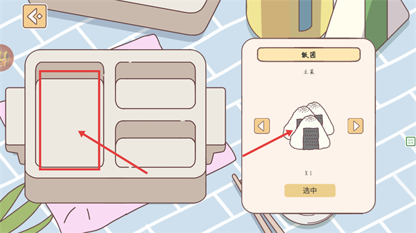 2、点击便当盒的对应区域,选择主食类的【饭团】,再点击界面中的“选中”按钮,即可将其添加到便当内。