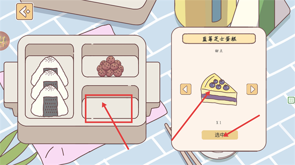 3、在便当盒的甜点区域,选择【蓝莓芝士蛋糕】这一甜点,点击“选中”按钮,将其添加到便当来丰富搭配。
