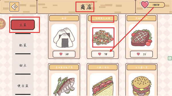 4、进入【商店】的【主菜】分类,消耗70爱心即可购买【海鲜意大利面】,以此获取更多主菜食材完善午餐便当。