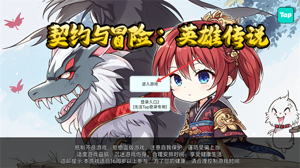 1、打开【契约与冒险:英雄传说】,点击【进入游戏】按钮启动游戏,该游戏适合16周岁以上玩家参与,需合理安排游戏时间。