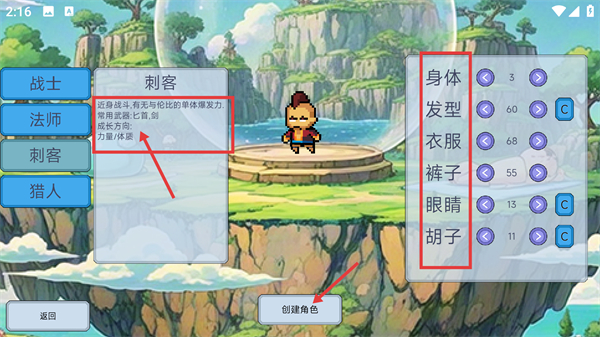 2、创建角色时可选【刺客】职业,其为近身战斗型,有超强单体爆发力,成长方向为【力量/体质】,还可自定义外观各模块。