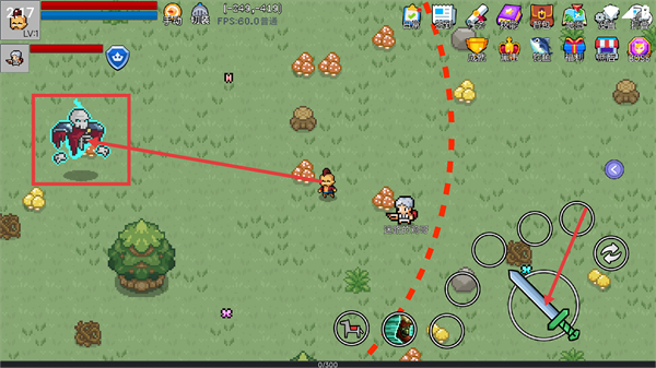 3、进入游戏后角色为【LV1】,界面底部攻击按钮可触发战斗,需点击该按钮对战场景中的怪物,推进初期冒险进程。