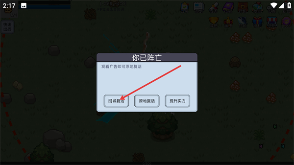 4、战斗阵亡后会弹出界面,可选择【回城复活】返回城镇,也可观看广告原地复活,建议先提升实力再挑战对应怪物。