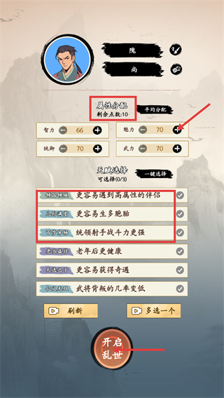1、在属性分配界面,用【剩余点数:10】调整属性,勾选【倾国倾城】-【儿孙满堂】等天赋后,点击【开启乱世】进入游戏。