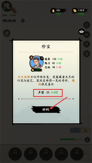 4、收下【方天画戟】后,获得【声望:25(+20)】等增益,点击【好的】关闭提示,继续进行游戏。