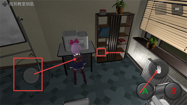 4、操控左侧移动按钮靠近架子,定位箭头指向的物品,点击【A】互动按钮收集它,助力【找到教室钥匙】的任务。