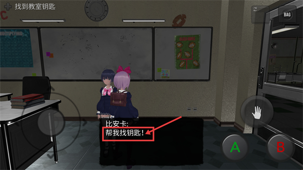 3、接取【找到教室钥匙】的任务后,根据【比安卡】的【帮我找钥匙】请求,着手在教室内搜寻相关道具。