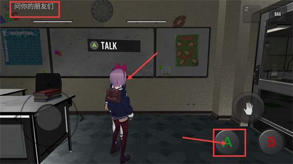 2、看到【问你的朋友们】提示后,靠近粉发角色,点击界面的【A】按钮触发【TALK】互动,推进当前剧情。