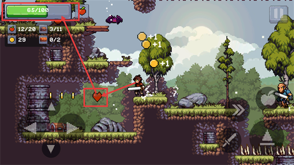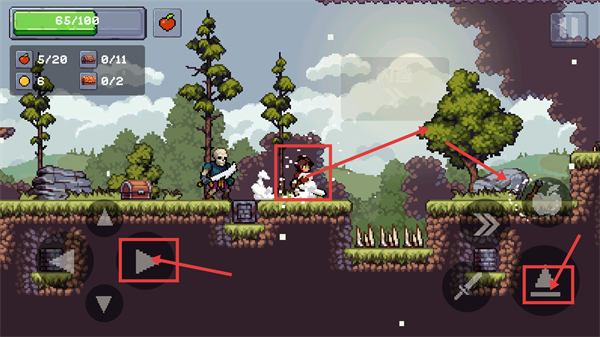 1、操控左侧按钮移动角色,靠近敌人后点击右侧攻击键击败敌人,可与场景内的宝箱获取道具,遇到平台落差时,点击右侧跳跃键完成移动。