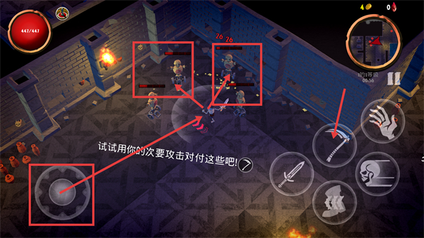2、通过界面移动轮盘操控角色,按提示使用次要攻击,应对【26-26】血量的敌人,快速处理当前区域的敌方目标。
