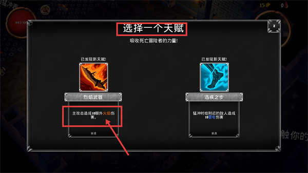 4、完成对应操作后解锁天赋选择,可选【烈焰武器】加主攻击10-火焰伤害,或【迅疾之步】提升猛冲的实战效果。
