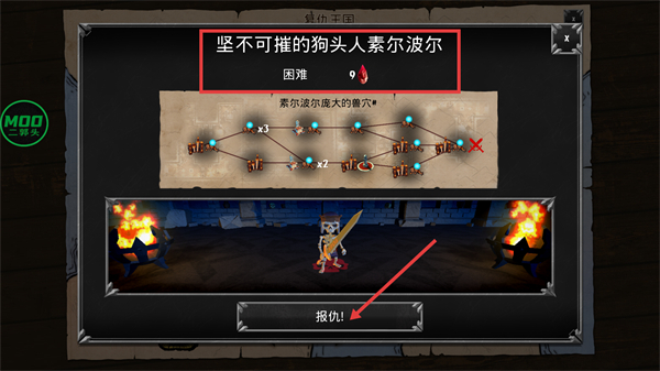 1、进入【坚不可摧的狗头人索尔波尔】关卡,难度【困难】消耗【9-宝石】,点击【报仇!】进入【索尔波尔庞大的兽穴】。