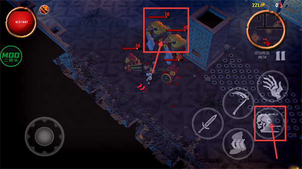 2、战斗中应对【30-血量】的敌人,用技能按钮输出,维持【417/441-生命值】,当前【6-等级】,积累金币准备升级。