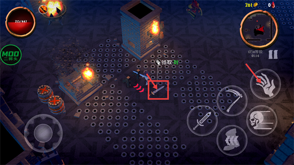 3、击败敌人后靠近【剑】,点击拾取按钮获取该武器,当前【215/441-生命值】、【261-金币】,装备后提升输出能力。