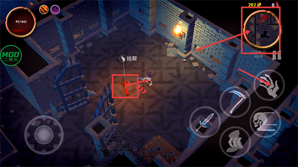 4、参考【地图】指引移动,拾取场景内的道具,当前【93/441-生命值】、【297-金币】,拾取后继续向目标区域推进。