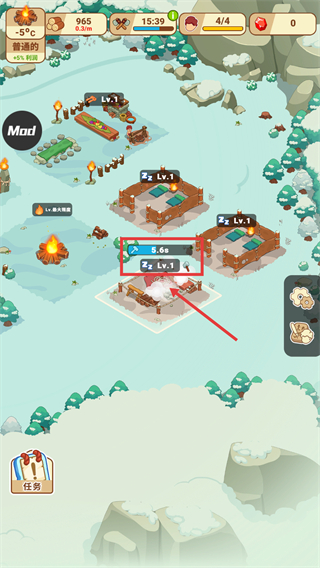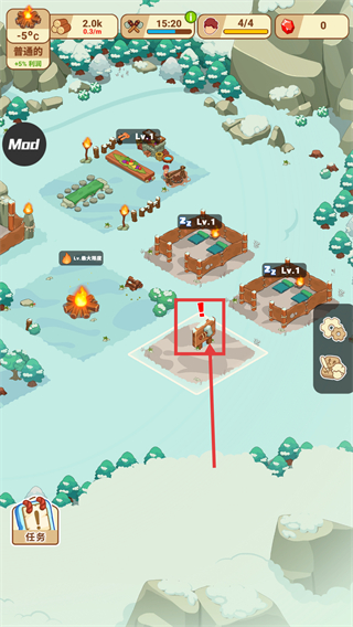 1、关注【-5℃】的环境状态,木材当前【2.0k-0.3/m】,点击带感叹号的建筑,推进【任务】进度,维持资源产出节奏。