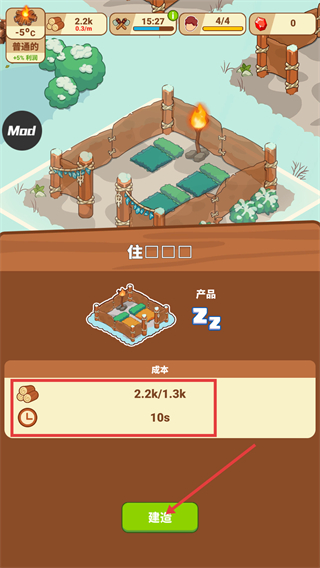 2、进入住所建造界面,消耗【木材-2.2k/1.3k】并等待【10s】,点击【建造】按钮,获取对应产品提升居住能力。