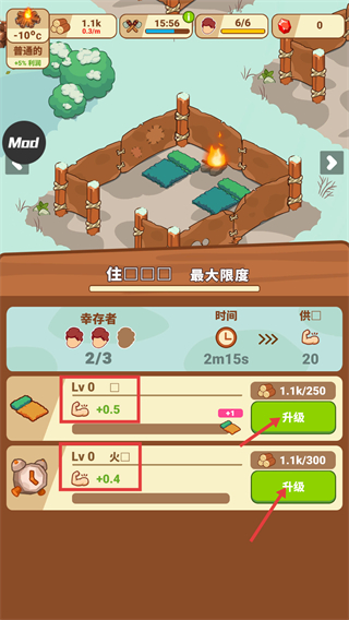 4、在住所界面查看幸存者【2/3】,消耗木材点击【升级】,提升【Lv0-+0.5】等属性,增强生存相关能力。