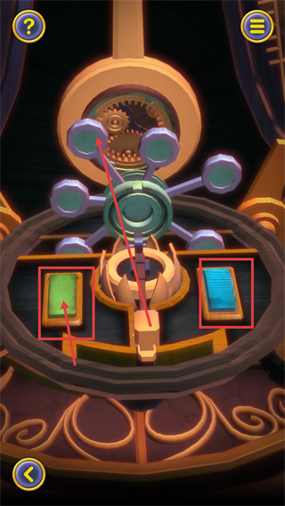 2、观察场景中的【绿色板块】与【蓝色板块】,调整齿轮部件位置,使其与板块功能匹配以推进解谜。