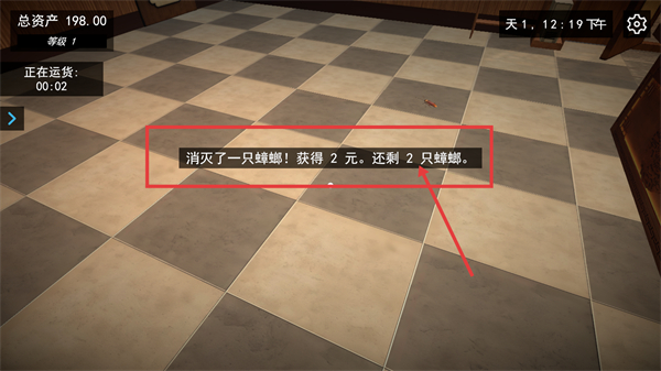 2、留意【总资产-198.00】【等级-1】,消灭蟑螂可获资产,按提示清理【消灭了一只蟑螂!-获得-2元-还剩-2只蟑螂】的剩余目标。