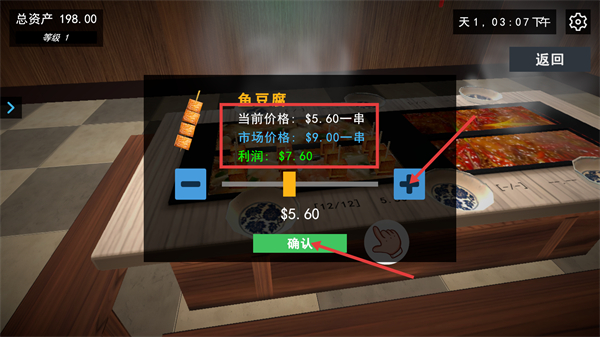 3、针对【鱼豆腐】设置【当前价格:$5.60一串】,核对【市场价格:$9.00一串】【利润:$7.60】后点击【确认】完成定价。
