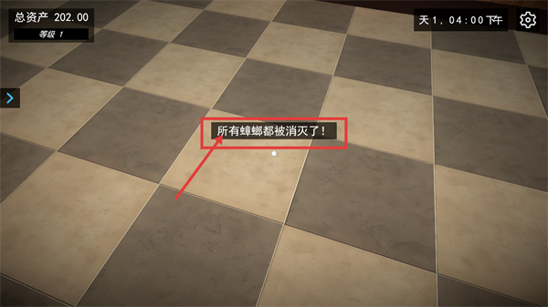 4、确认【所有蟑螂都被消灭了!】的提示,此时【总资产-202.00】【等级-1】,完成清理任务并推进后续流程。