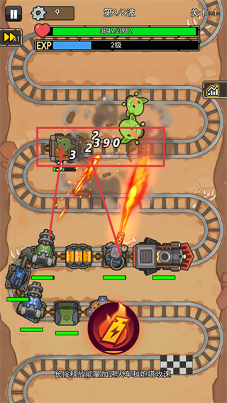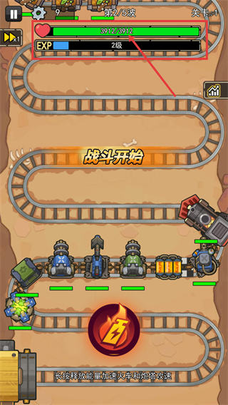 2、战斗开始后,长按界面中的能量按钮,可【加速火车和炮塔攻速】,同时留意当前【2级】的状态与生命值变化。