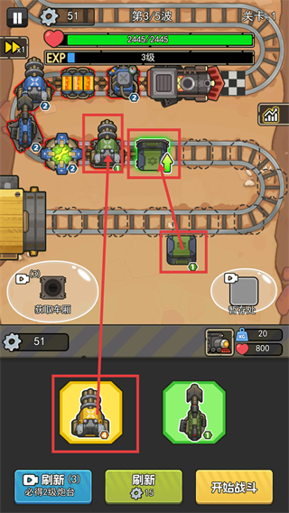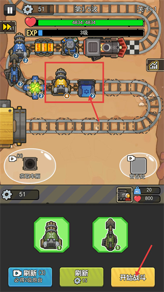 1、处于【关卡-1】【第3/5波】,将【炮塔】与【车厢】上阵到空位,借助刷新获取的炮塔完成布置,准备点击【开始战斗】。
