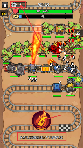 3、战斗时长按能量按钮,触发【加速火车和炮塔攻速】效果,留意【生命值-4791/4834】,应对【第3/5波】敌人。