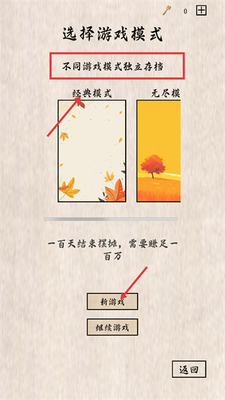 2、选择【经典模式】并点击【新游戏】,该模式与其他模式独立存档,核心目标是在一百天内赚足一百万资金。