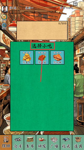 3、第1天持有【资金-100元】,需在【选择小吃】界面选定【炸薯片】等品类,以此开启当日的摆摊经营流程。